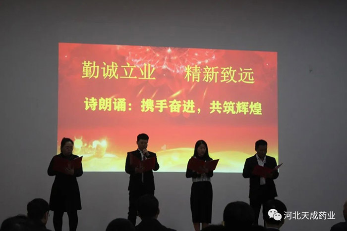 公司董事長王振剛,公司董事、常務(wù)副總經(jīng)理王顥,公司董事、天成藥業(yè)總經(jīng)理兼渤海分公司總經(jīng)理孫元清,公司董事、天成藥業(yè)副總經(jīng)理、渤海分公司常務(wù)副總經(jīng)理田長有,公司董事、天成藥業(yè)常務(wù)副總經(jīng)理王琦,及來自各分公司、各生產(chǎn)車間、各科室部門的領(lǐng)導(dǎo)和同事近200人出席了此次年會。