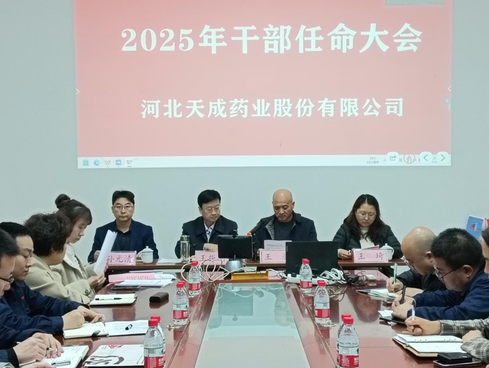 3月19日,河北天成藥業股份有限公司召開了2025年度干部任命大會,宣布了新一屆中高層管理人員的任職決定。此次會議旨在系統性優化組織架構,選拔并任命一批兼具專業能力與管理經驗的骨干力量,為企業發展注入新動能。董事長王振剛、常務副總經理王顥及核心管理層、中層及以上干部齊聚一堂,共同擘畫企業管理發展的新藍圖。