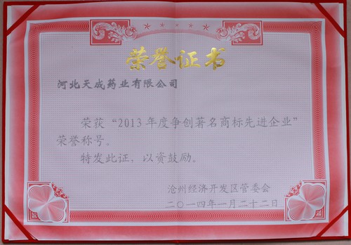 2014年榮獲“2013年度爭創(chuàng)著名商標(biāo)先進(jìn)企業(yè)”榮譽(yù)稱號